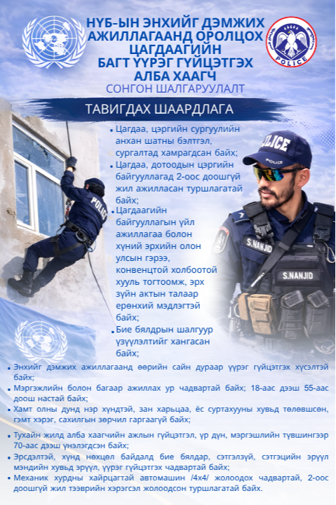 НҮБ-ын энхийг дэмжих ажиллагаанд оролцох цагдаагийн багт үүрэг гүйцэтгэх алба хаагч сонгон шалгаруулалт, тавигдах шаардлага
